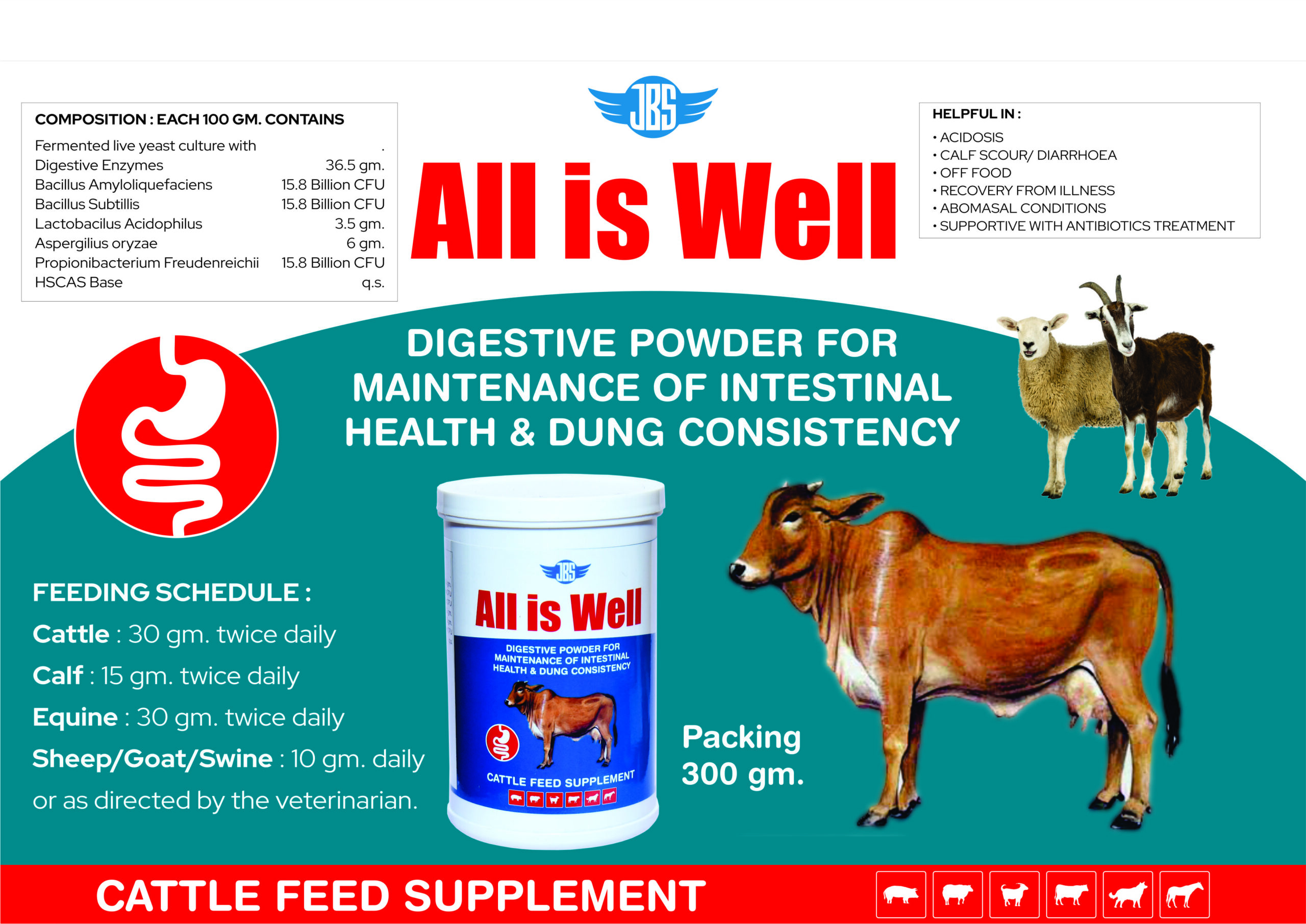 All is Well is a digestive enzyme & probiotics powder that maintains intestinal health, improves dung consistency, and supports animals during digestive disorders.