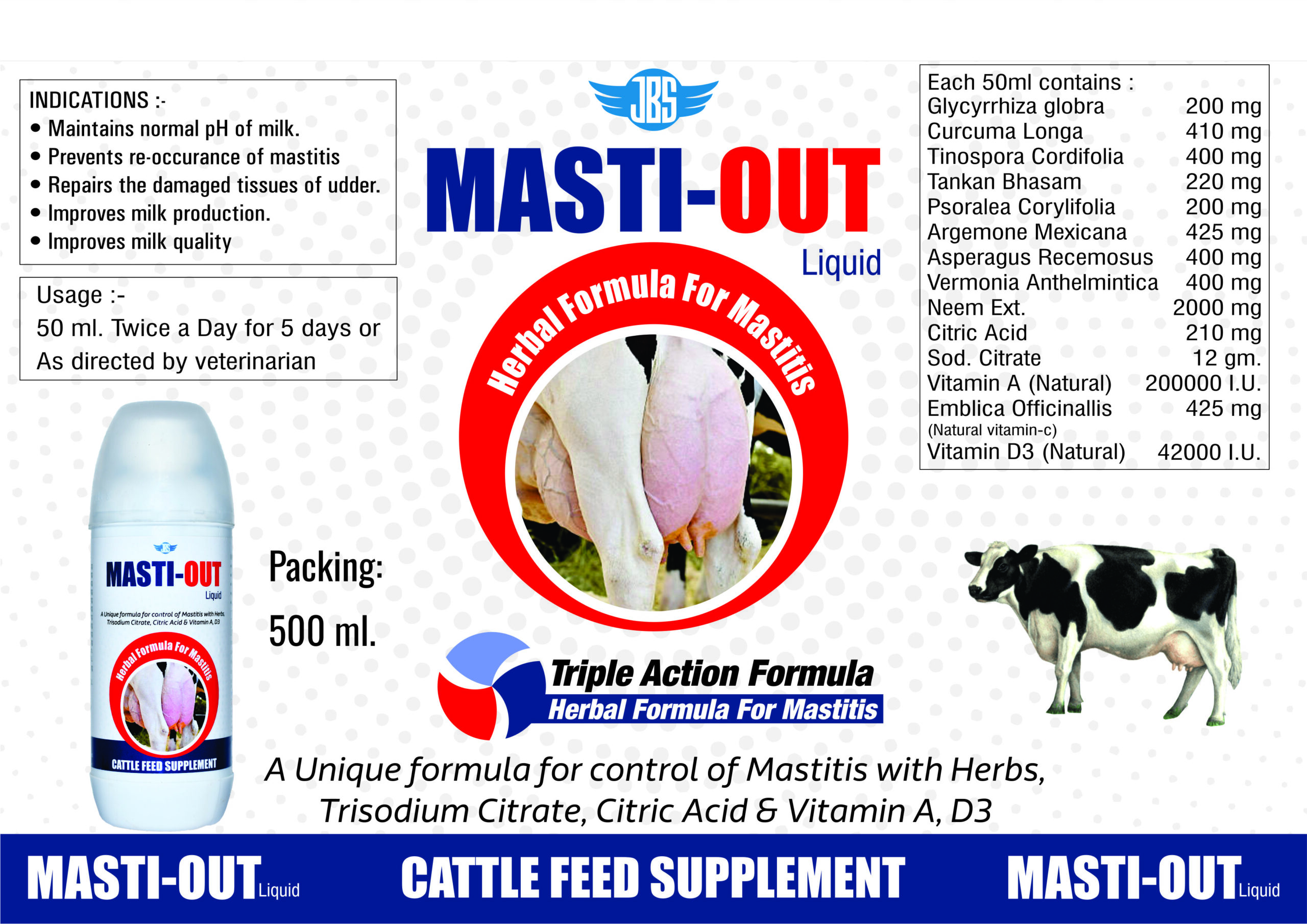 Masti-Out Liquid is a herbal mastitis control formula enriched with Trisodium Citrate, Citric Acid, natural herbs, Vitamin A & D3 to support udder health and prevent re-occurrence of mastitis.